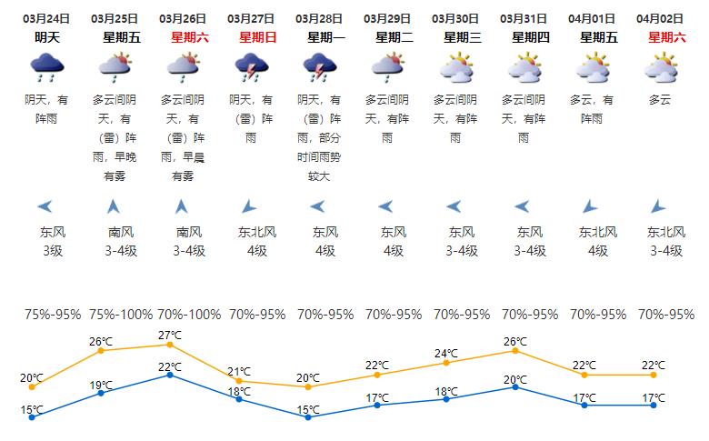 3月26日—28日有(雷)阵雨,部分时间雨势较大,气温明显下降;
