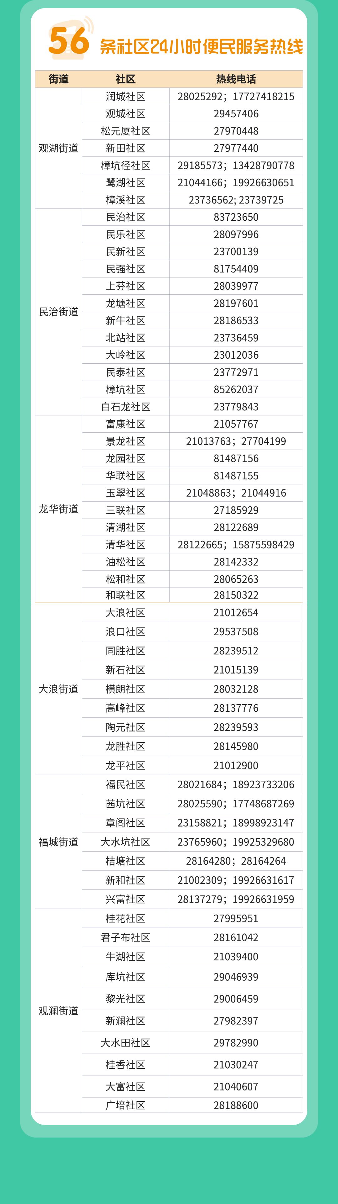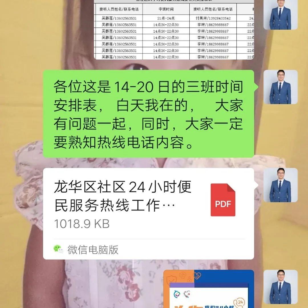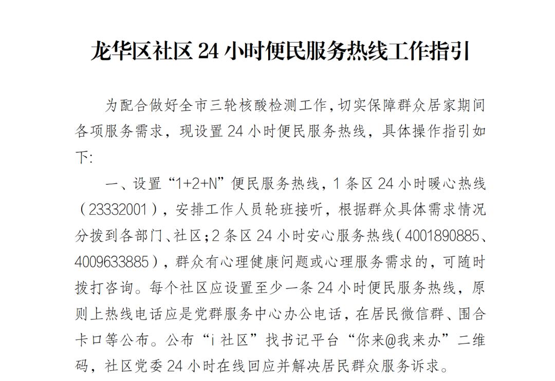 龙华区迅速吹响战斗号角,将各级党群服务中心就地转为抗疫服务中心,制定下发《龙华区社区24小时便民服务热线工作指引》,内容含对接线员的工作培训、“三区”居民医疗服务保障工作流程图、24小时便民服务热线问答参考等。依托“1+2+56”便民服务热线,为居民群众提供政策咨询、心理疏导、生活帮助等服务。让居民群众表达诉求有渠道、有着落,接线员回应诉求有依据、有速度。