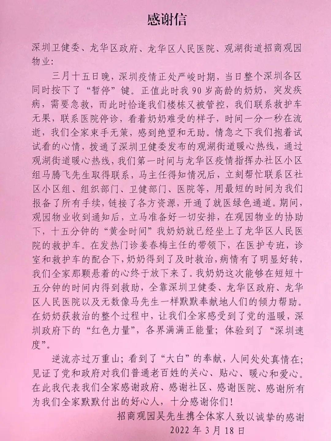 3月15日晚,住在观湖街道招商观园的吴先生突然发现92岁的奶奶突发疾病,特殊时期,进出小区都需要流程及证明,于是吴先生紧急拨通了便民服务热线。通过观湖街道暖心热线,吴先生与龙华区疫情防控办社区小区组取得联系。情况紧急,相关负责人立刻联系了龙华区卫健局和龙华区人民医院,15分钟“黄金时间”,吴先生的奶奶便搭上救护车顺利到达医院,以最快的速度安排老人就诊,这让吴先生悬着的心终于放了下来。(点击回顾详情:有呼必应!一封感谢信,揭开龙华暖心热线背后的故事→)