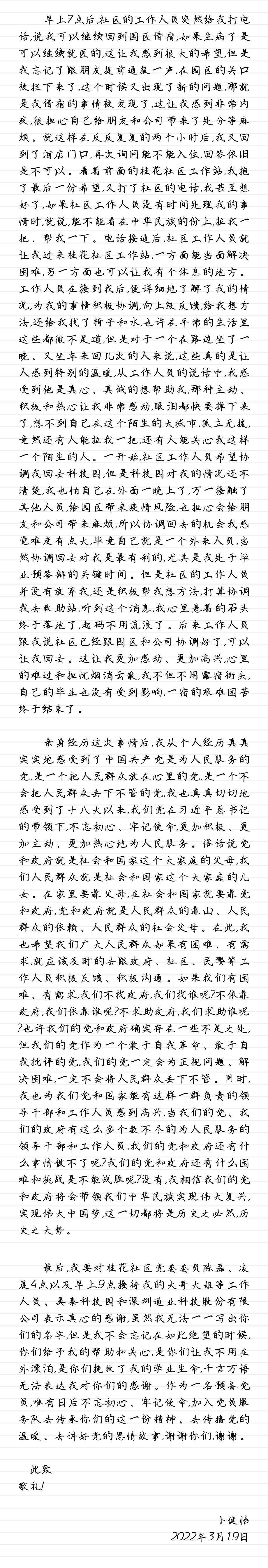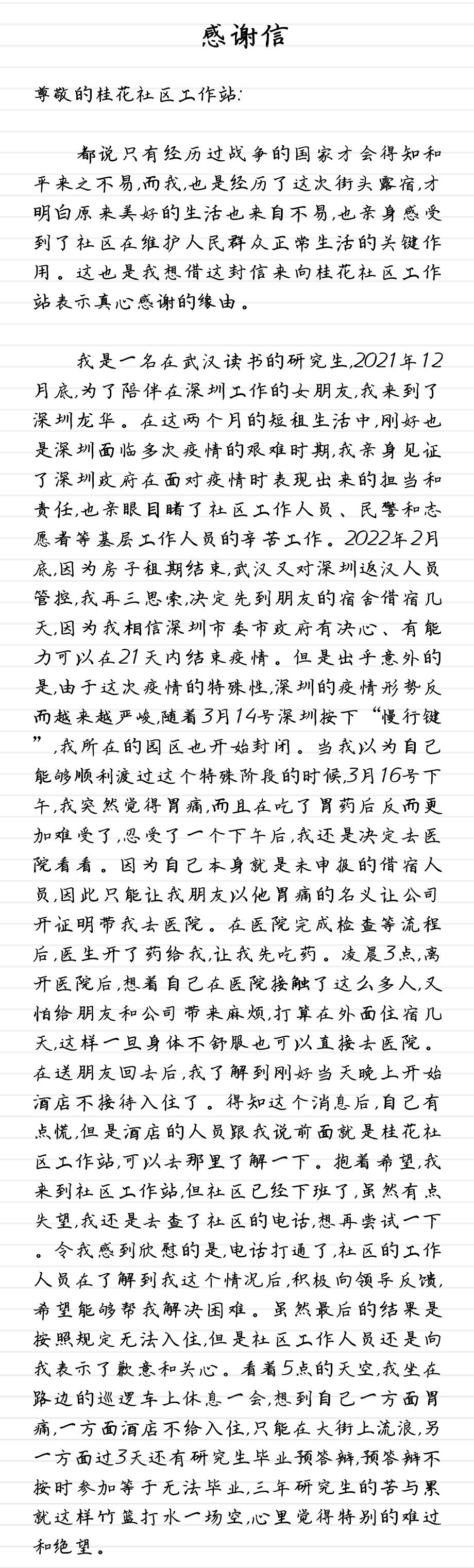 “我3月14日从外地来深,疫情原因还未入职,现在身上的钱所剩无几,无法承担旅店住宿费用,且无亲友可投靠,想寻求帮助。”观澜街道桂花社区便民服务热线接电后,第一时间联系该男士,与关心关爱小组前往其所在地送去口罩、面包、水等暖心物资,并帮助做核酸采样,最后贴心地将他安置在临时庇护点,为他配置生活物资和防疫物资,并鼓励他积极参与防疫志愿服务。