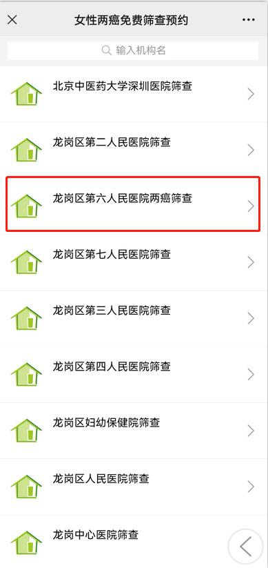 3. 选择您想要预约的检查项目,再点击”龙岗区第六人民医院“。