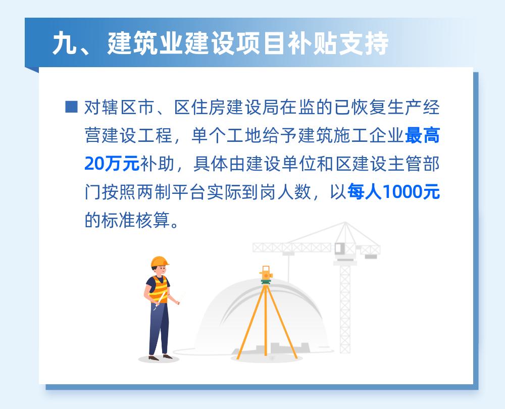 发放在建项目临时停工补贴。对辖区范围内区住建、区水务、区城管、区交通以及街道在监的已开工建设工程,在政府依法采取停工等紧急措施期间,按市区政府部门停工通知前一天录入“两制”平台的劳务工人数给予900元/人的补贴给企业,相关补贴由企业通过“两制”平台发放至劳务工人账户。(牵头单位:区住房和建设局)
