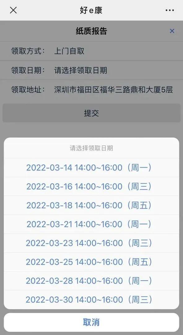 ★ 3、若纸质报告选择“上门自取”需要选择领取日期,支持周一、周三、周五到第一健康门店领取纸质报告。提醒:需要至少提前一天预约给门店预留打印时间哦,当天申请无法当天领取。