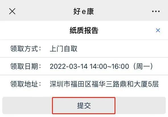 纸质报告领取地址默认是体检的分院,检查领取时间无误后,确认“提交”即可。
