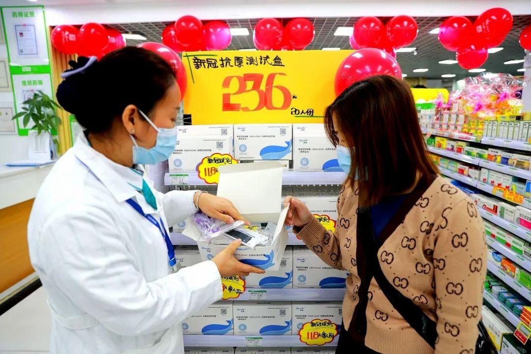 国大药房向顾客现场演示了试剂使用的方法和步骤。王女士说,“我平时下班的时间不太固定,有时候回到家没有时间去核酸检测点排队做核酸。有了新冠抗原检测试剂,不出家门就能够快速知道检测结果,国大药房的药师还贴心地给我演示了使用步骤。”