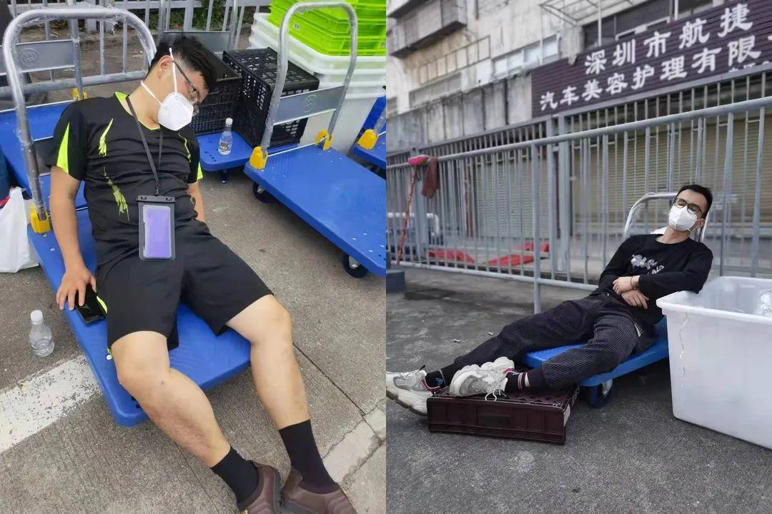 为了封控区内的居民能正常得到物资保障,每天干十几个小时,尽管腰酸背痛,困了也只能躺在小推车休息一会,但只要来了货,立马起身就是接着干。