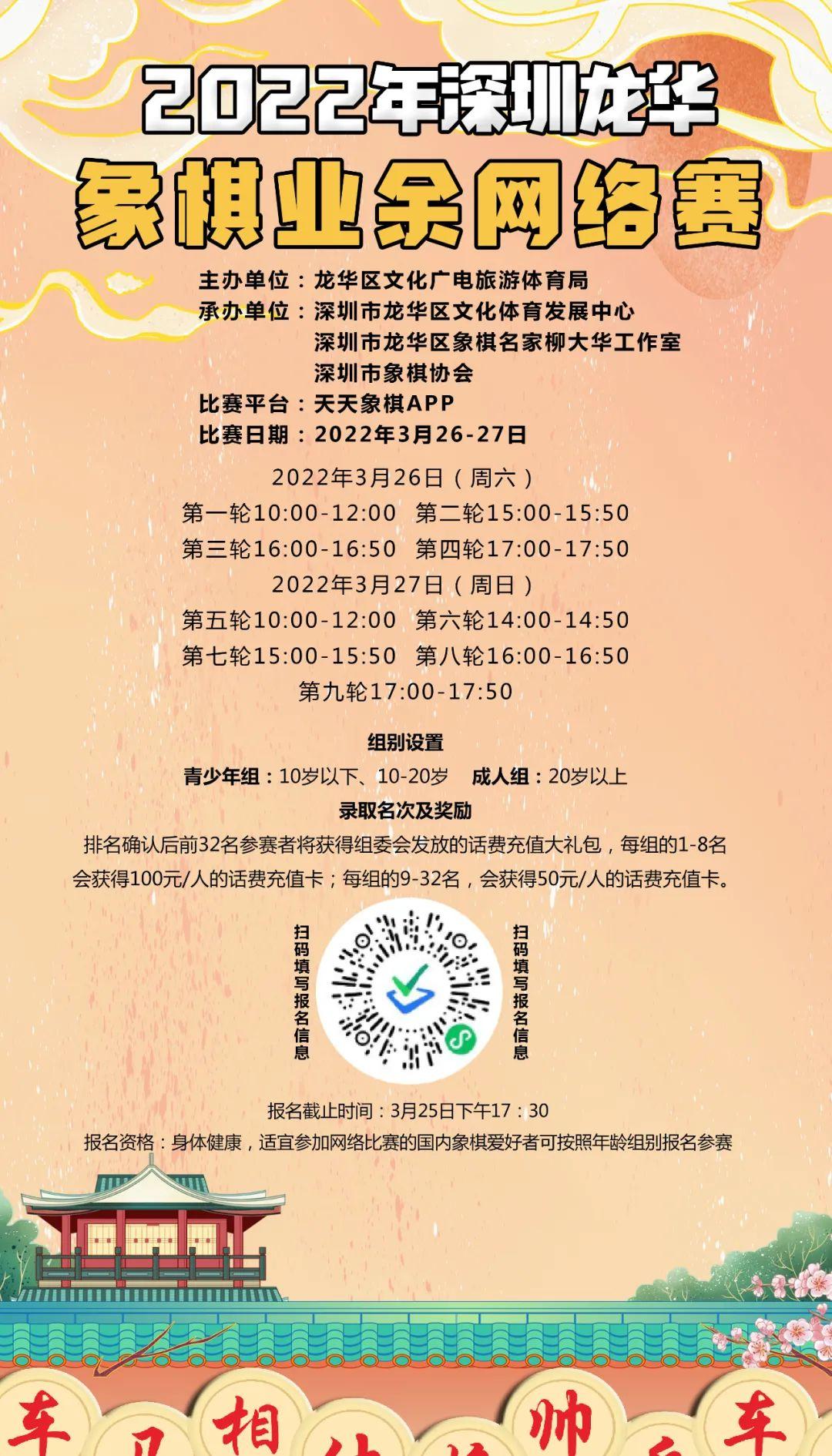 进一步丰富我市广大市民的业余生活,继承和发扬中华民族的优良文化传统,正确引导市民的思想政治文化,提高文化修养和道德素质,增进友谊、建设和谐深圳,现组织开展2022年龙华区线上运动月系列活动之象棋业余网络赛。