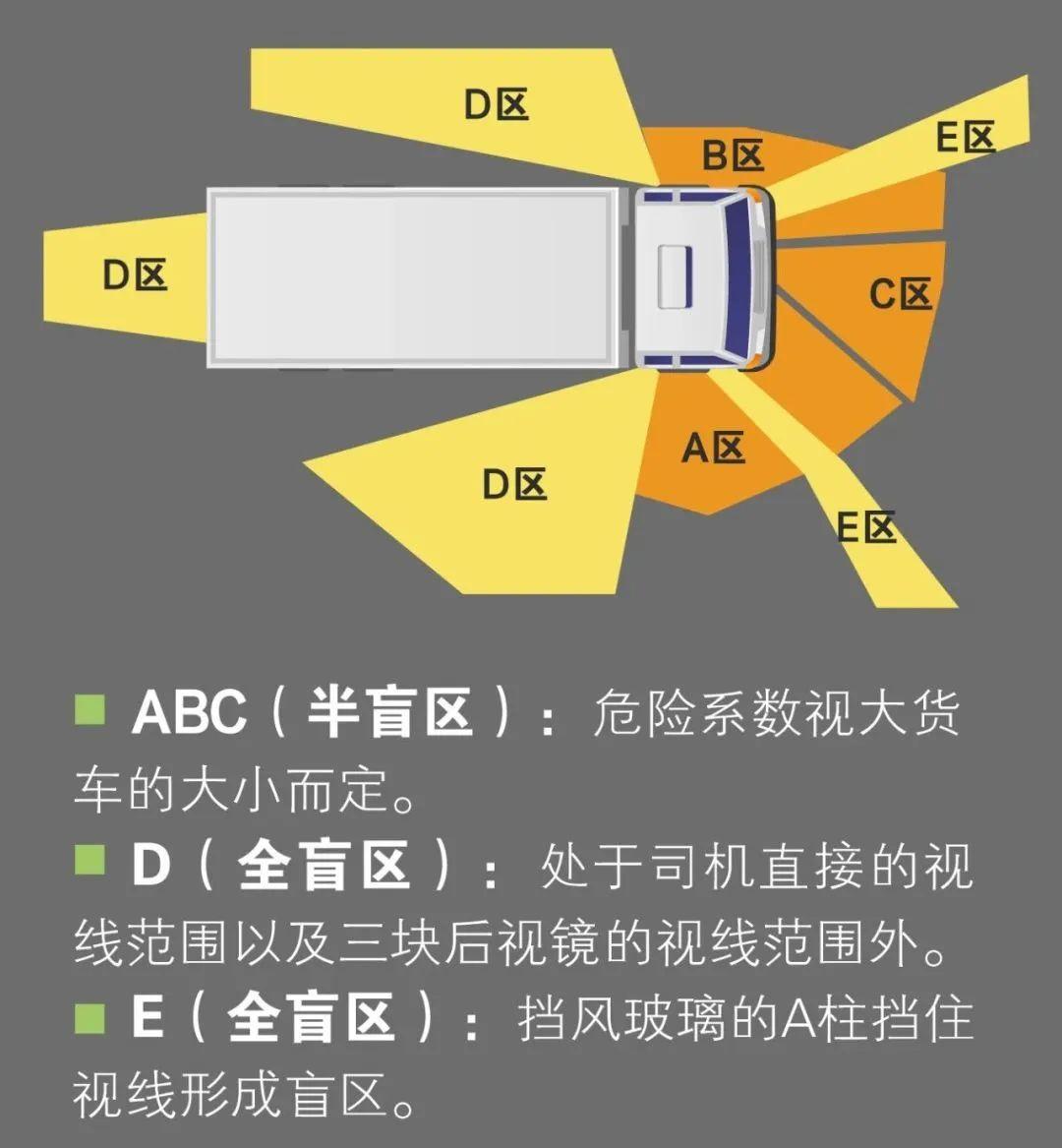 务必远离大型车辆盲区,尤其是大型车辆右转时,切勿抢行或贴行!