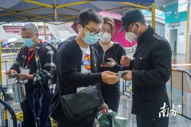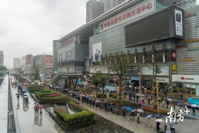 3月23日上午,天上下着小雨。在深圳华强北步行街上,人们撑着五颜六色的雨伞排成长龙,准备进行核酸检测。