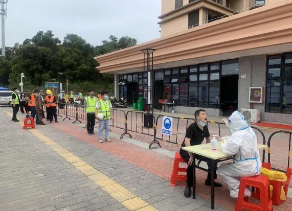 为严格落实市、新区和建筑工务署各级防疫要求,中国建筑第六工程局有限公司对其负责施工的市第二十三高级中学等项目进行封闭式管理,与新区建筑工务署一同积极协调大鹏办事处,为项目开设临时核酸检测点,减少人员流动,满足广大工友核酸检测需求。同时,为确保核酸检测高效进行,项目管理人员组成志愿者队伍,提前通知并帮助工友进行登记排队,高效有序配合防疫人员进行核酸检测。