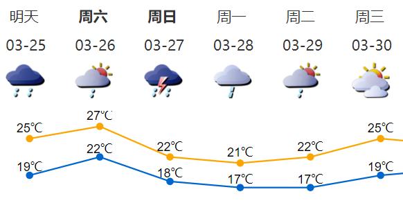 25日阴天间多云,天气迅速转暖湿,早晚有雾,有(雷)阵雨,部分时间雨势较大,气温19-25℃。