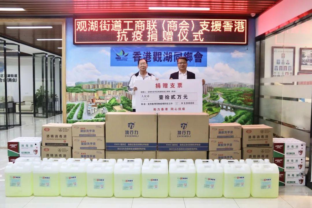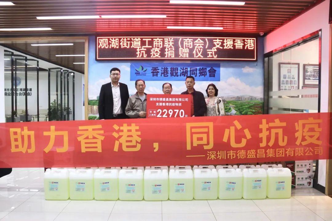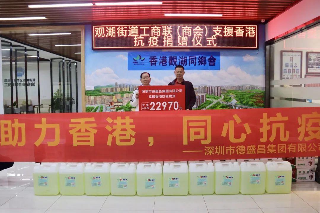 3月23日下午,深圳市龙华区观湖街道工商联(商会)举行了支援香港抗疫捐赠仪式,观湖街道工商联(商会)向香港观湖同乡会捐赠了人民币十二万元,深圳市德盛昌集团有限公司也向香港观湖同乡会捐赠了价值人民币两万两千九百七十元的抗疫物资,捐赠项目将第一时间用于援助香港抗疫。