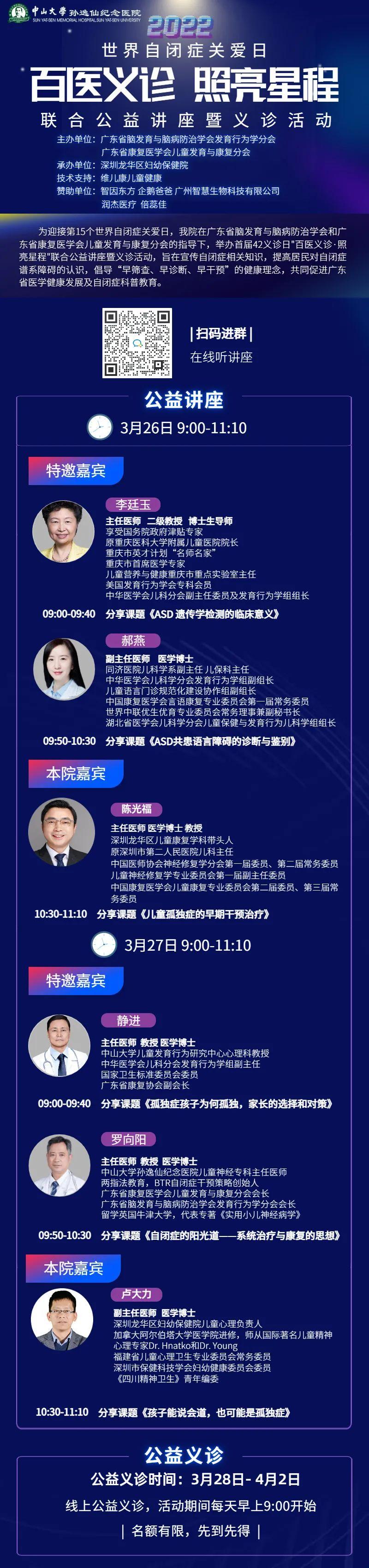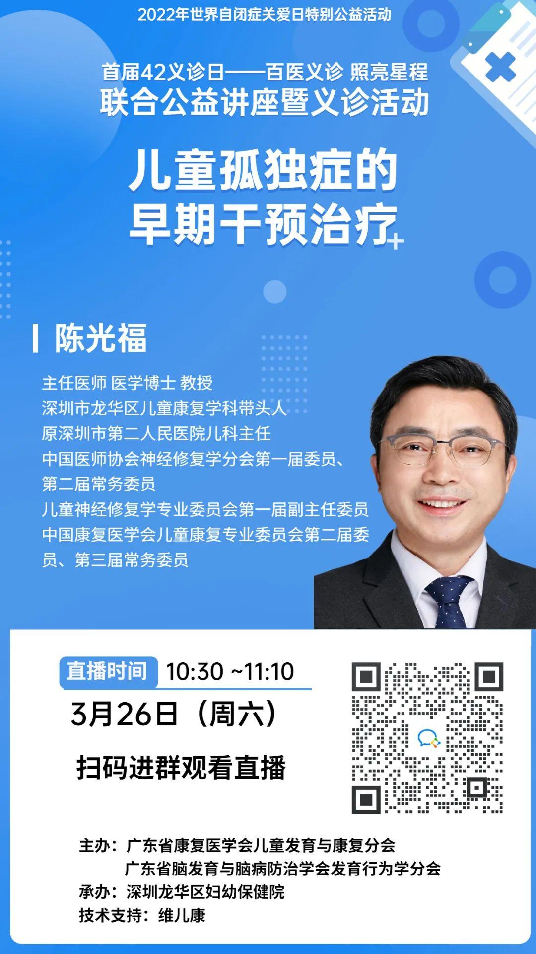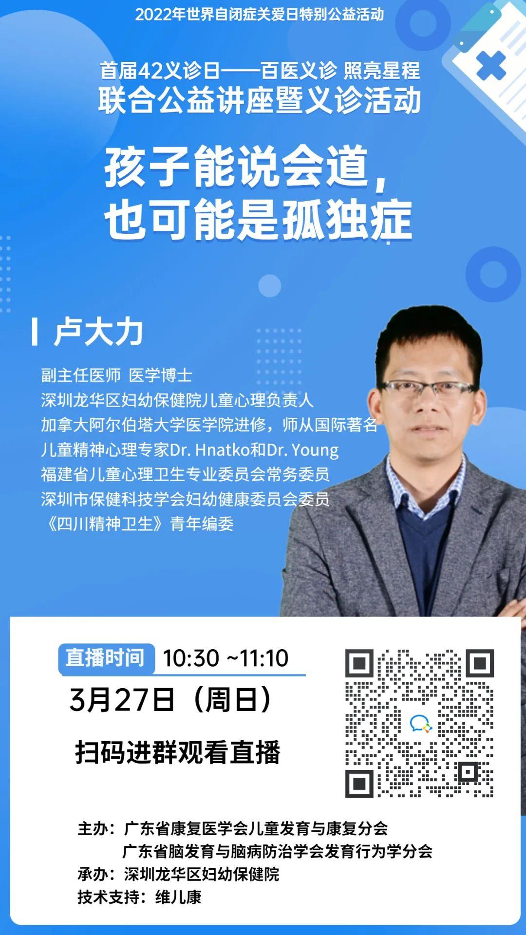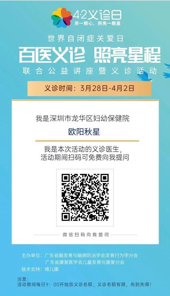 2022年4月2日是世界第十五个国际自闭症日,为了帮助家长更好地了解特殊儿童,助力孩子健康成长。深圳市龙华区妇幼保健院将与广东省康复医学会儿童发育与康复分会、广东省脑发育与脑病防治学会发育行为学分会联合举办百医义诊、照亮星程在线听讲座活动和线上公益义诊活动,拒绝时间和距离的隔阂。
