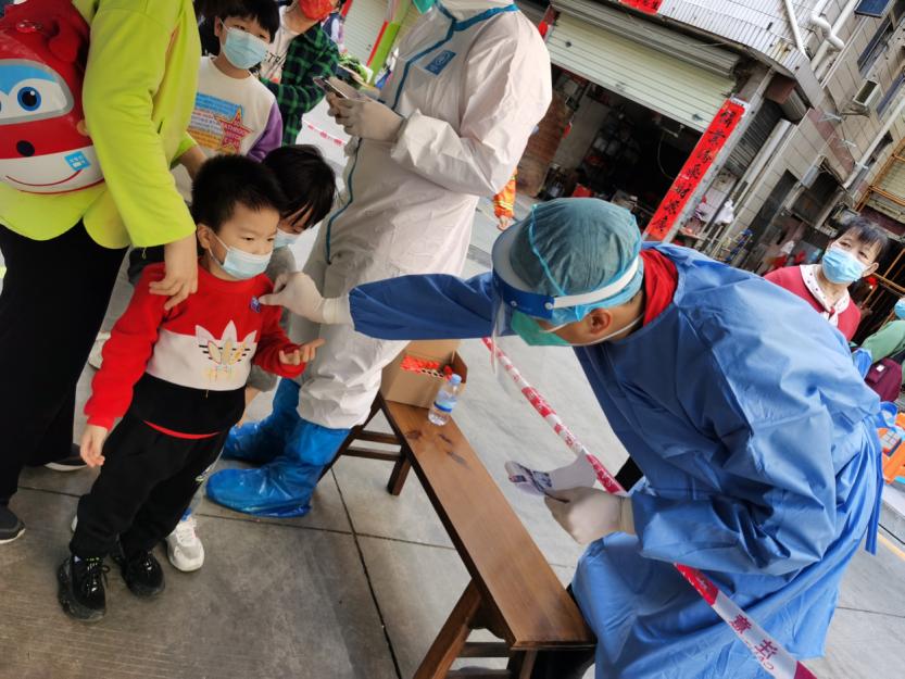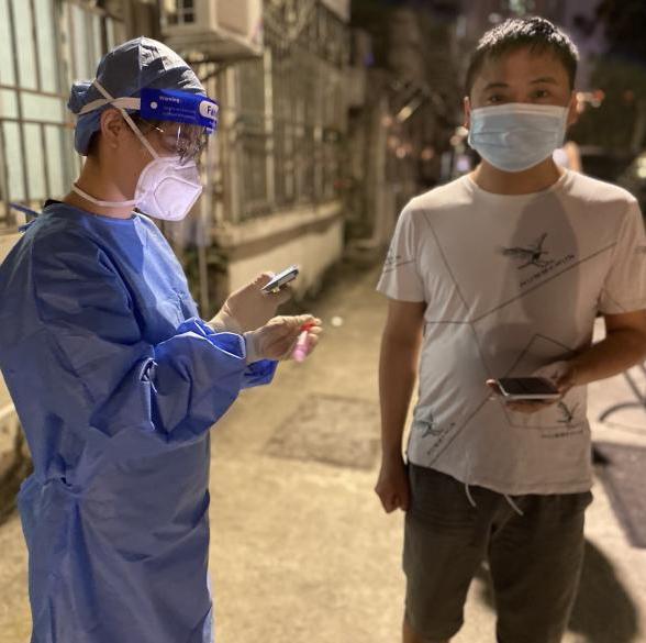 身着二级防护服,每天协助医护人员扫码、采集核酸是教师李泽钦的必修课。从第一次上岗时的手忙脚乱毫无经验,到后来的轻车熟路,“单管、混管、红码、绿码”准确判断随时切换,是他一次次身着防护服不吃不喝、全身湿透换来的工作成果。