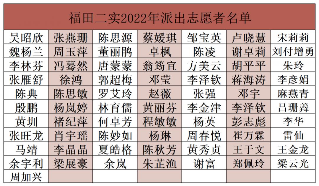 为全力配合深圳市疫情防护工作,贡献自己的绵薄之力,在福田区教育局的统筹组织之下,福田区第二实验学校积极响应上级号召,全体教职员工闻令而动,踊跃报名参与抗击疫情的志愿行动。自2022年1月以来,学校教职工参与防疫志愿工作累计85人。