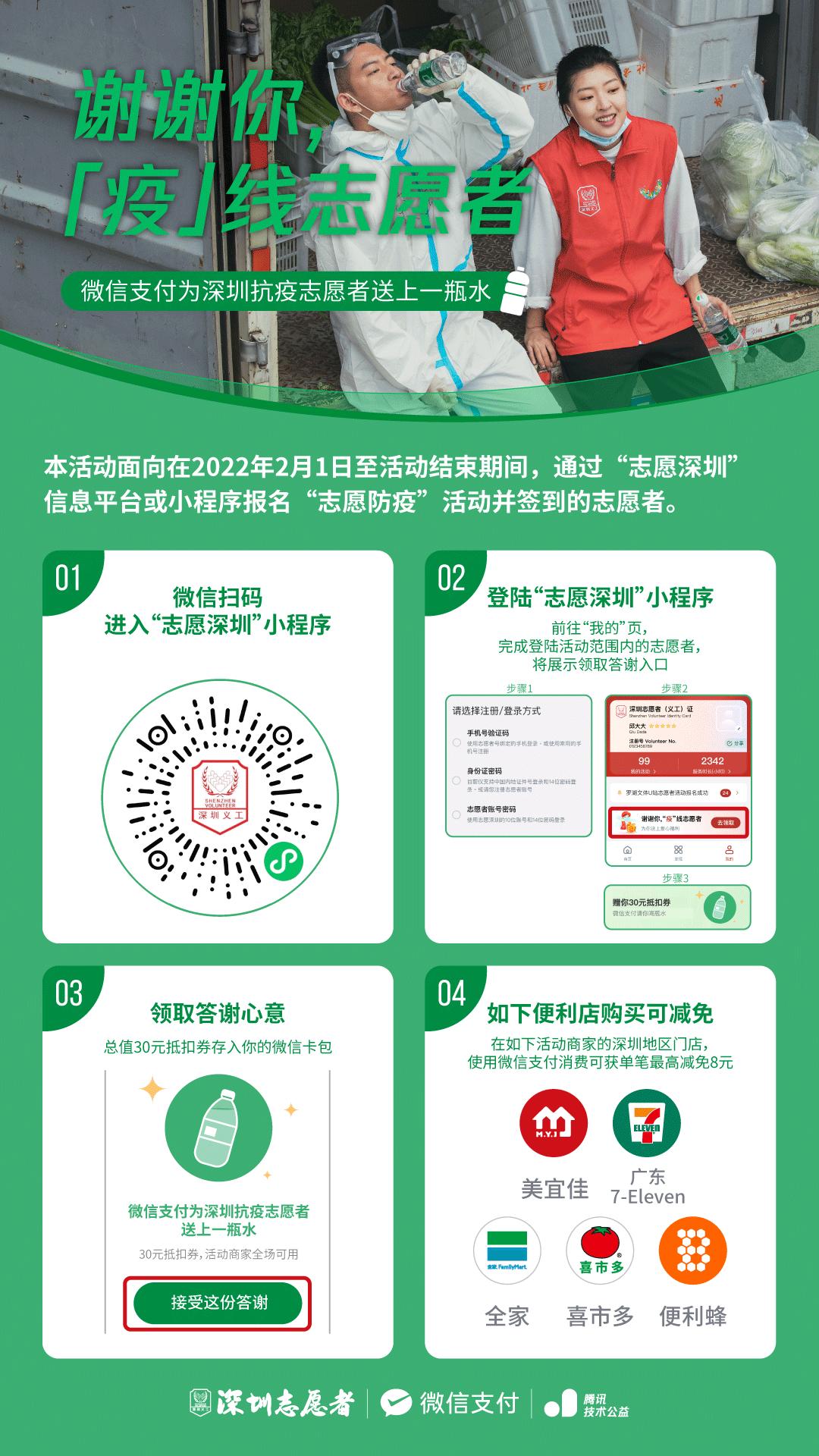 为了向深圳抗疫志愿者表达慰问和感谢,共青团深圳市委员会、深圳市志愿者联合会、微信支付、腾讯技术公益,联合深圳线下近4000家便利店,共同发起“为深圳抗疫志愿者送上一瓶水”活动,以发放赠饮抵扣券的方式,致敬这群可爱的英雄。