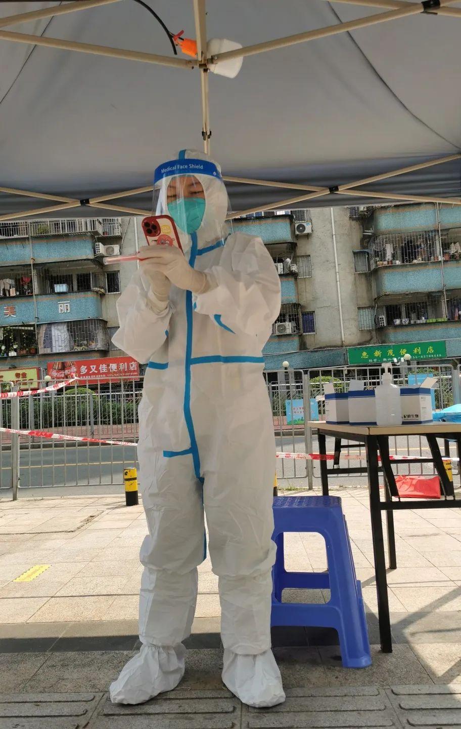 青年教师赖丹琦居住的小区刚刚解封,就第一时间赶到梅林街道管控区闭环管理报到点与李彦婷老师汇合,参与七天闭环管理的防疫工作。