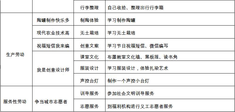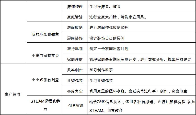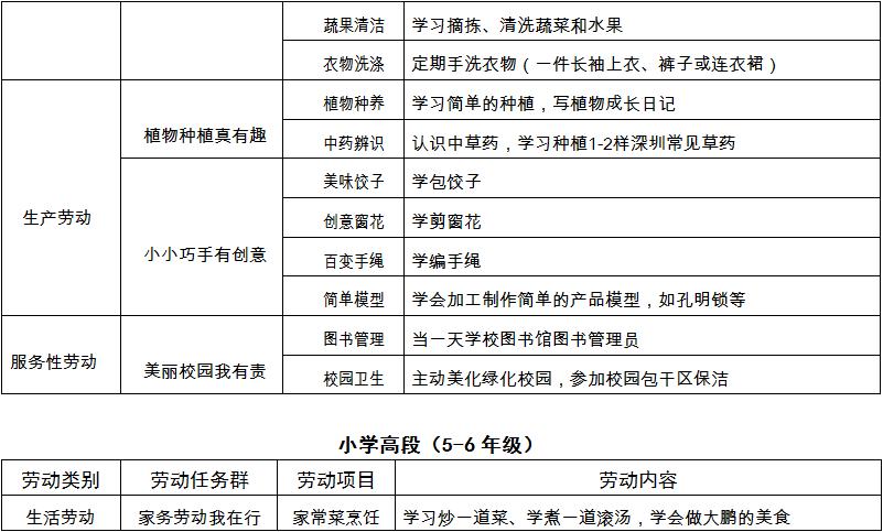 大鹏新区中小学生劳动教育参考清单