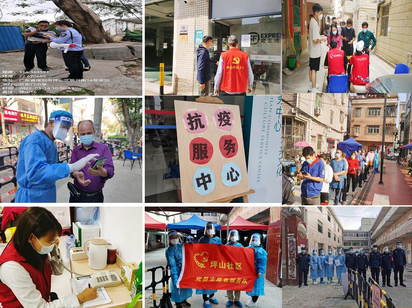 平日里各有服务侧重的十支志愿队伍在疫情防控工作中即刻变为“社区防疫志愿服务队”,向社区各个防疫卡口和核酸检测点源源不断地输入防疫力量。期间,居住在坪山社区及周边的许多党员同志主动请愿,积极支援社区防疫工作,如深圳技术大学党员教师赵老师、深圳技师学院党员教师严老师、退伍军人赵大哥等就地转为社区防疫志愿者,他们第一时间出现在了社区防疫现场,用实际行动发挥着党员先锋模范作用。在3月14日至20日期间,坪山社区防疫志愿者参与达103人次,服务约490小时。