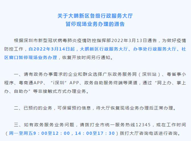 根据深圳市新型冠状病毒肺炎疫情防控指挥部2022年3月13日通告要求,大鹏新区行政服务大厅、办事处行政服务大厅、社区窗口自2022年3月14日起暂停现场业务办理。新区行政服务大厅全体工作人员主动请命补充一线防疫力量。