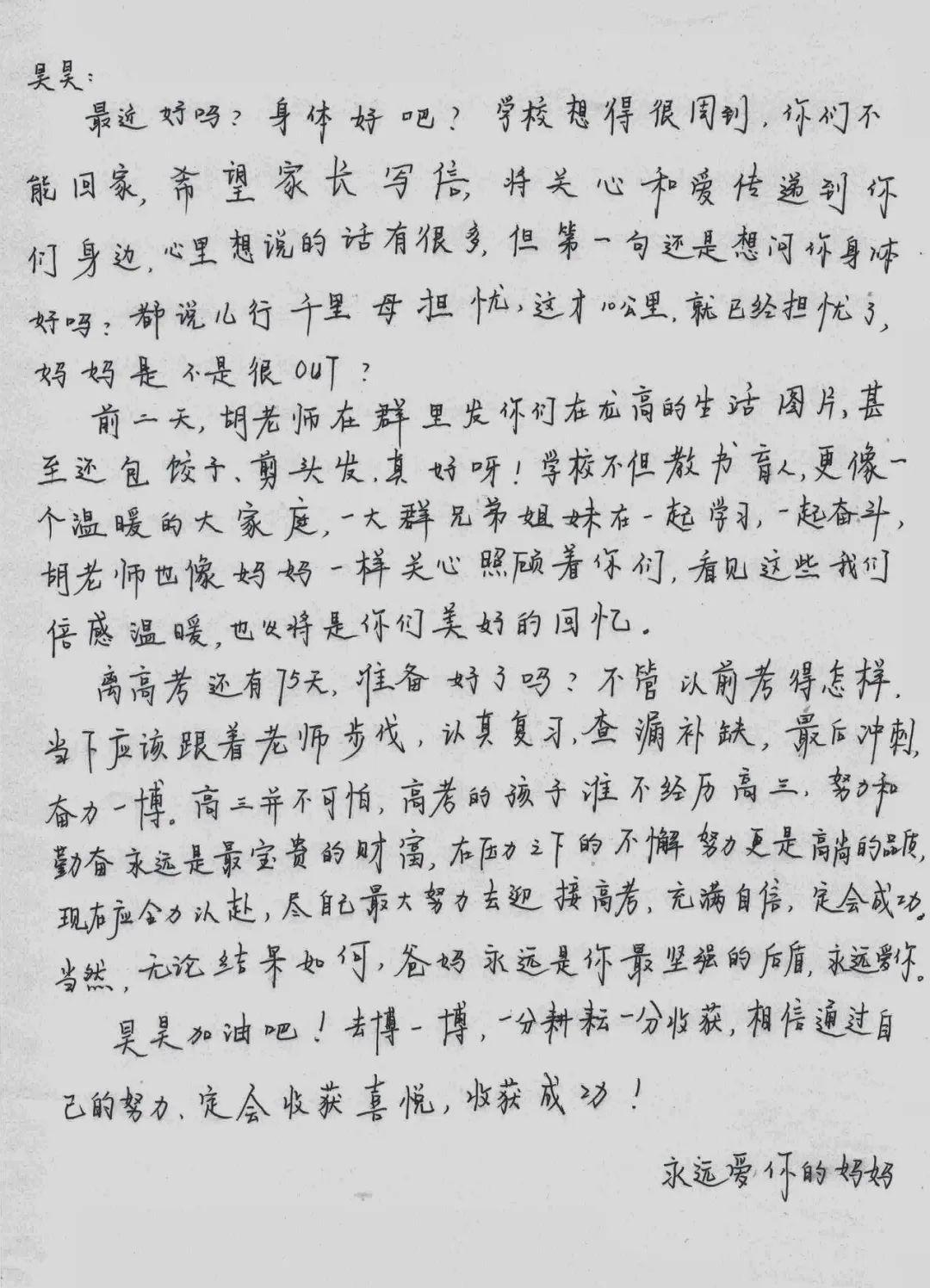 因为疫情,我们经历了这次分别。分别的时间从一个夜晚慢慢延长到一整天,从一整天慢慢延长到一个月,还会继续延长。想念你们之余,我想我能做到的就是努力把自己的每一件事都做好,不让自己的青春留下遗憾!