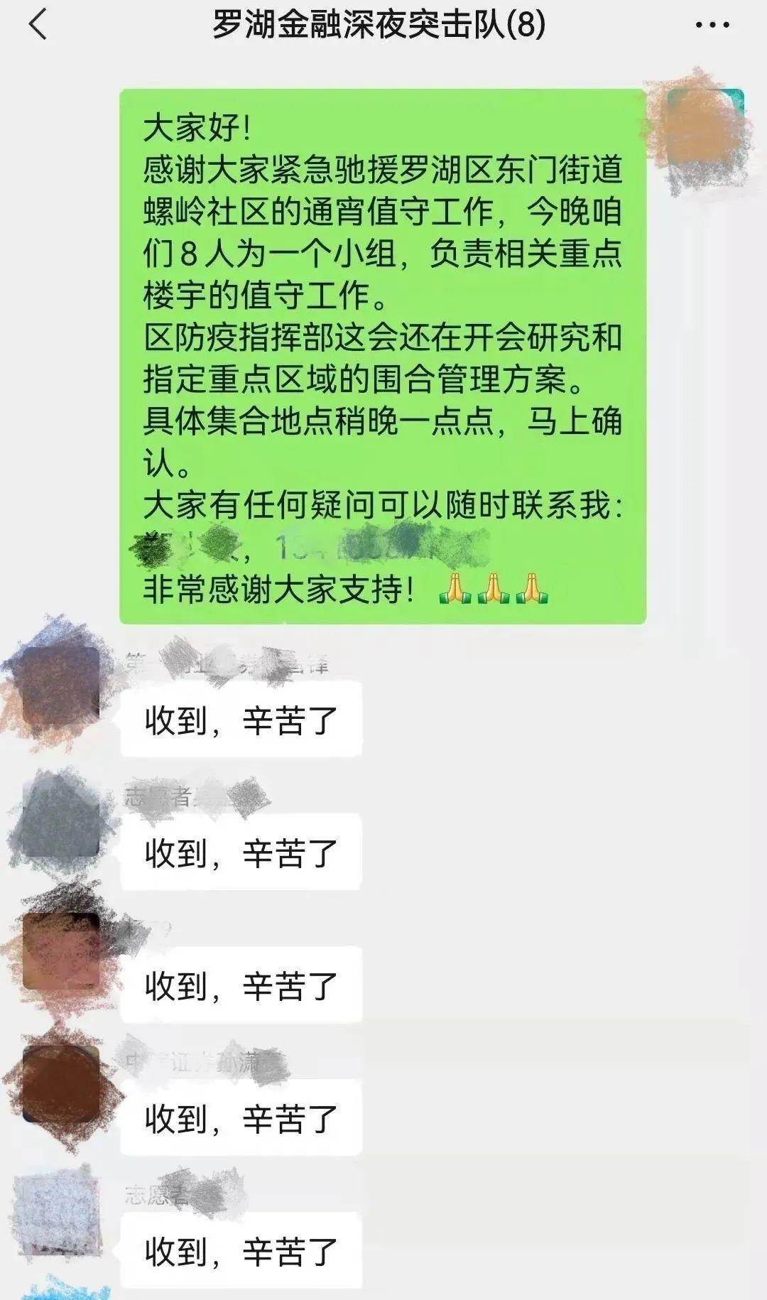 3月18日夜晚,在接到紧急支援的需求后,罗湖区金融行业协会迅速响应,于一小时内组建8人抗疫志愿服务队,紧急前往东门街道开展志愿活动。部分志愿者刚结束社区核酸点志愿工作,连衣服都没更换就主动请缨继续前来支援。