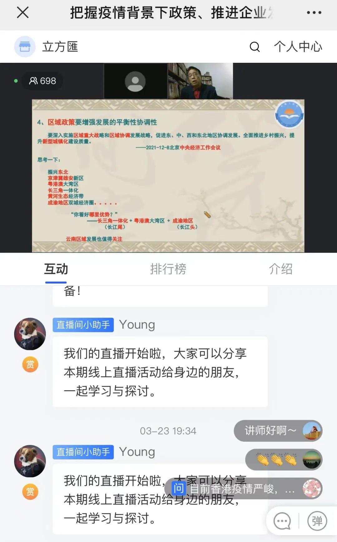 以上为直播截图,刘卫平教授为大家解读中央经济工作会议精神和2022年“两会”政策,讲述疫情下企业发展的途径与措施以及龙华区助企“十条”措施等。本次线上直播有近千人观看,大家纷纷在弹幕上踊跃发言。