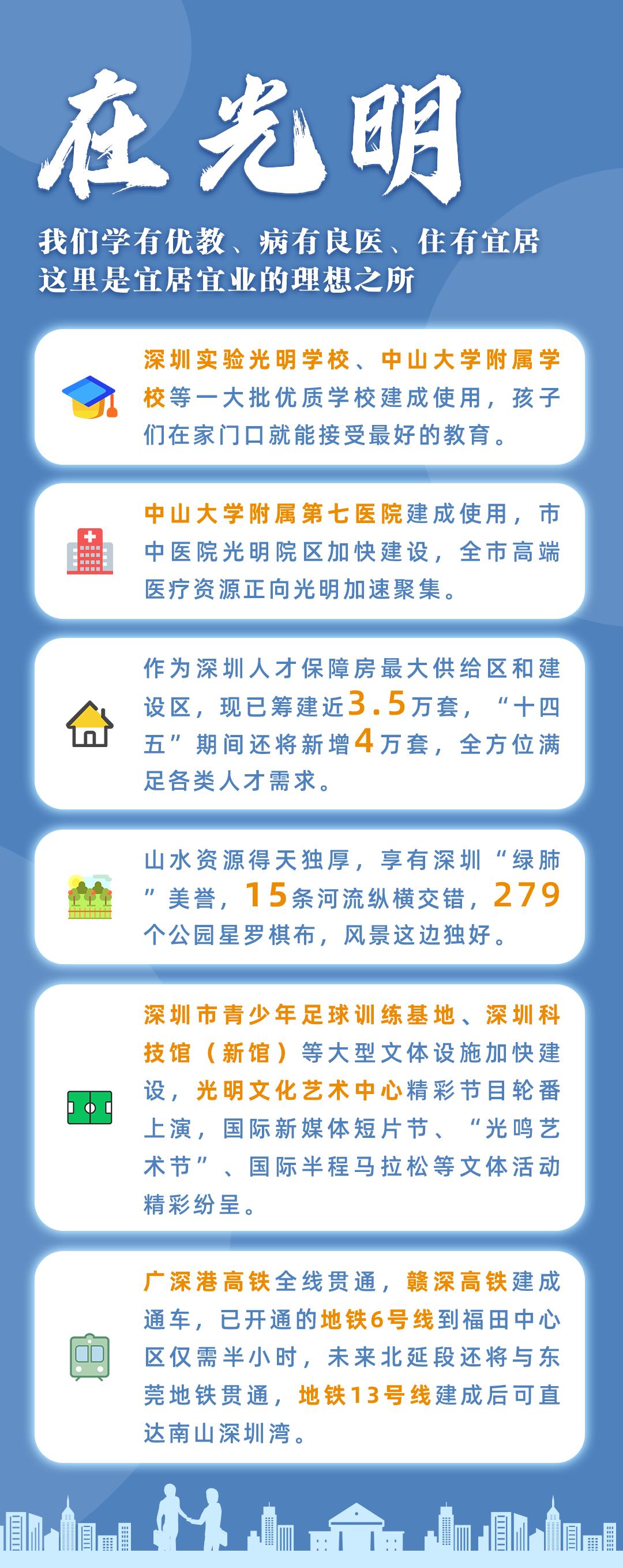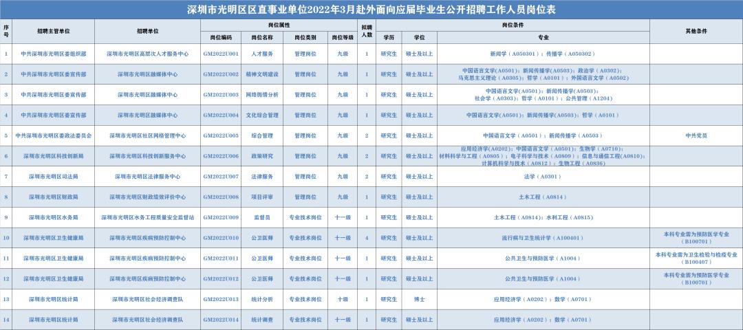 深圳市光明区区直事业单位赴外面向2022届毕业生公开招聘工作人员正式启动。全是区直事业单位岗位面向优秀应届研究生专业涵盖经济学、法学、工学、医学、文学……我们翻山越岭只为找你。快看看适合你的岗位只等你来逐梦光明2018年4月深圳市委、市政府决定在光明区集中建设大科学装置群聚力基础研究和应用基础研究赋予光明“世界一流科学城和深圳北部中心”全新定位目前脑解析与脑模拟、合成生物研究等首批大科学装置建设加快推进中山大学深圳校区中国科学院深圳理工大学深圳市工程生物创业创新中心深圳湾实验室等相继入驻启用未来已来,光明可期未来如你所想未来也一定如你所愿