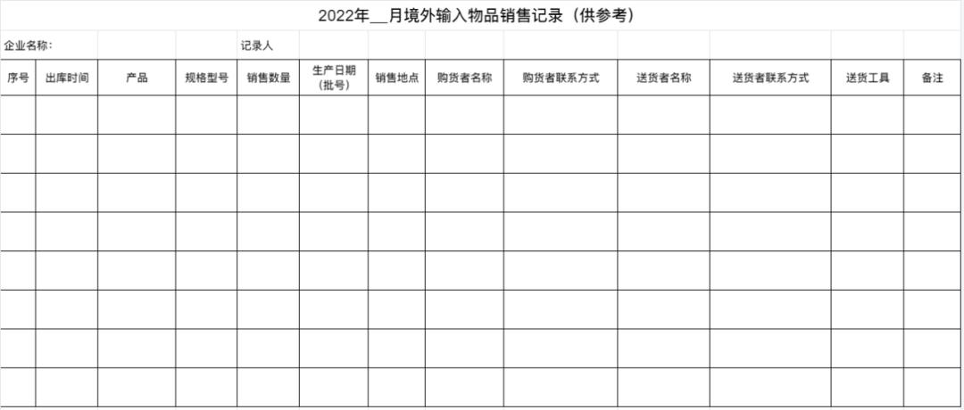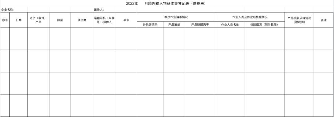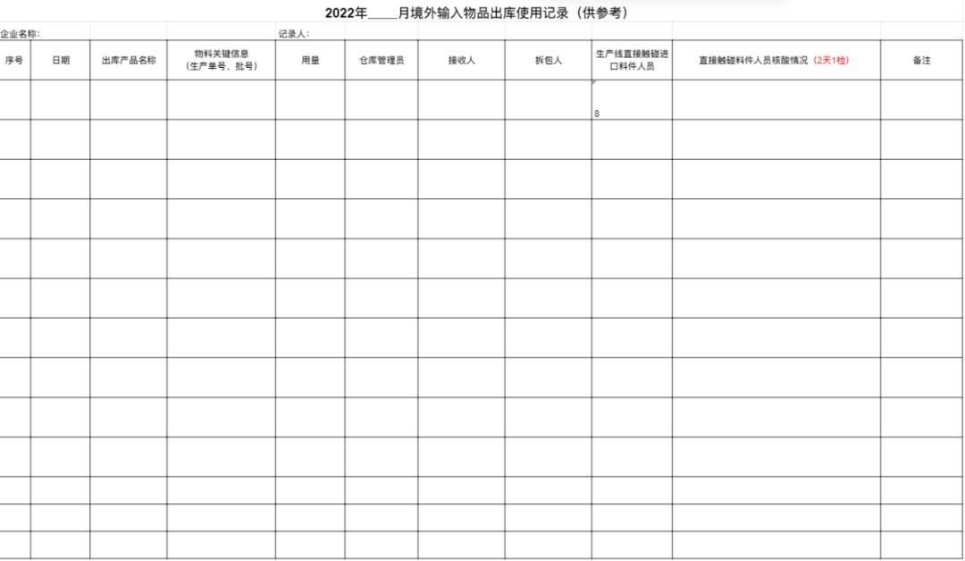 4.“一台账”是指生产经营单位要建立“一套台账”,制定境外输入物品流向台账,做好进货查验记录、投料记录、出厂销售记录和流向记录,做到来源可查、去向可追;建立重点岗位名单,跟踪重点岗位人员个人健康状况。通过区疫情防控平台“境外输入物品”模块录入“企业名称、企业性质、街道名称、社区名称、详细地址、企业防控责任人姓名、企业防控责任人电话、进口品类、进口商品去向、涉及冷链商品名称、重点岗位名称、单位场所识别码、街道管理部门、街道管理部门联系人”等信息要素,跟踪纳管重点岗位人员核酸检测情况。