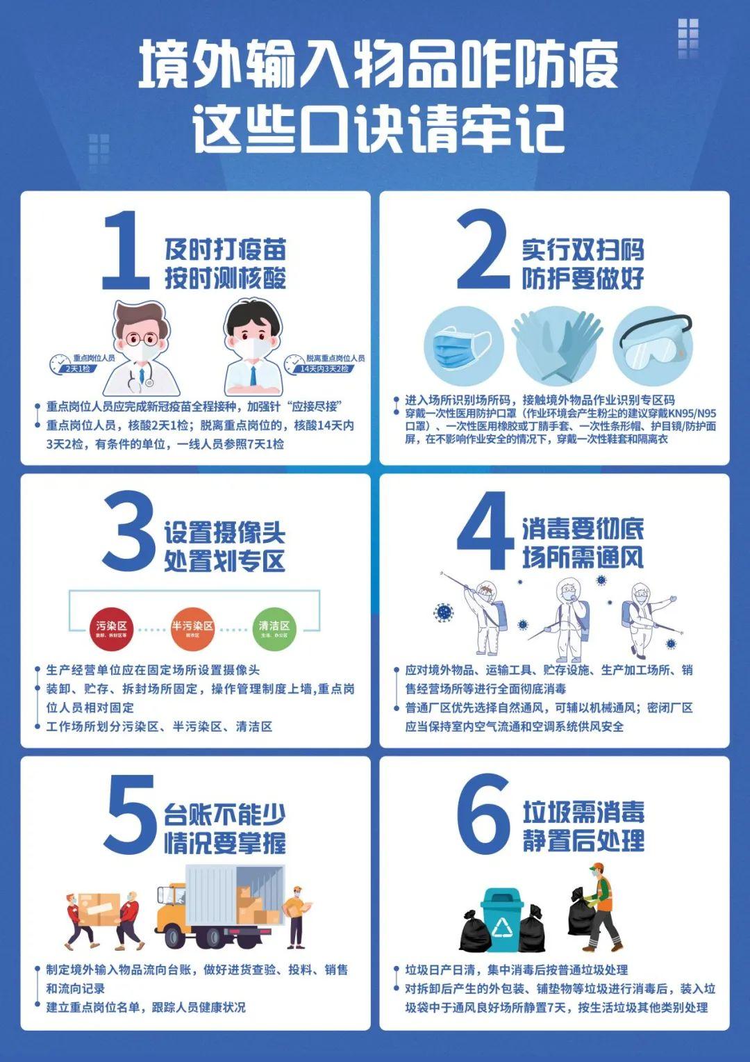 1.境外输入物品加工前,生产经营单位应采取科学消毒方法,按照“消一层、拆一层”加强货物、包装及原材料的的预防性消毒。
