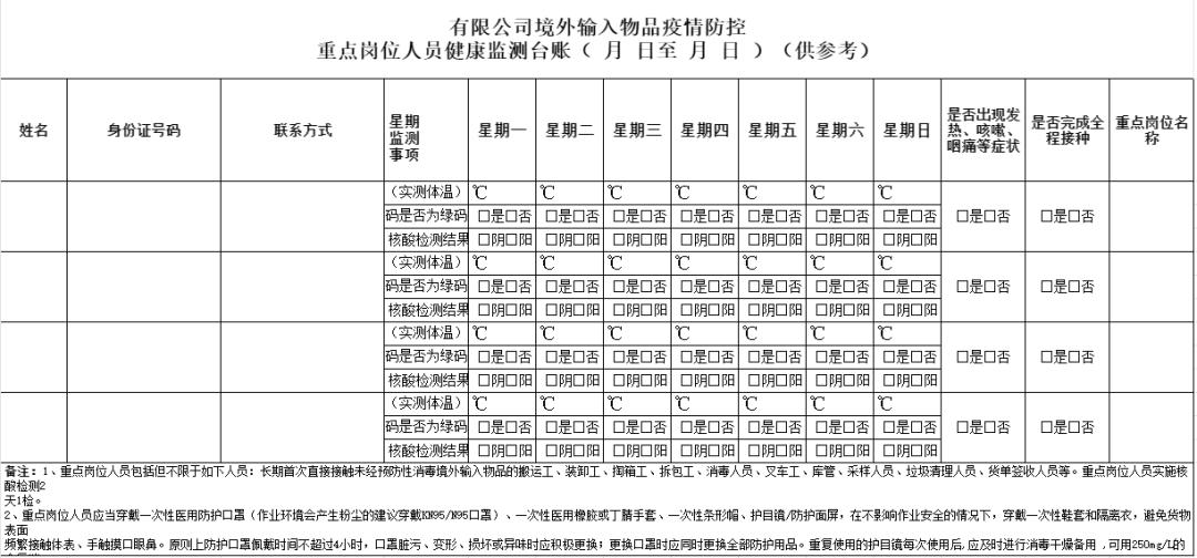 (2)重点岗位人员包括但不限于如下人员:长期首次直接接触未经预防性消毒境外输入物品的搬运工、装卸工、掏箱工、拆包工、消毒人员、叉车工、库管、采样人员、垃圾清理人员、货单签收人员等。
