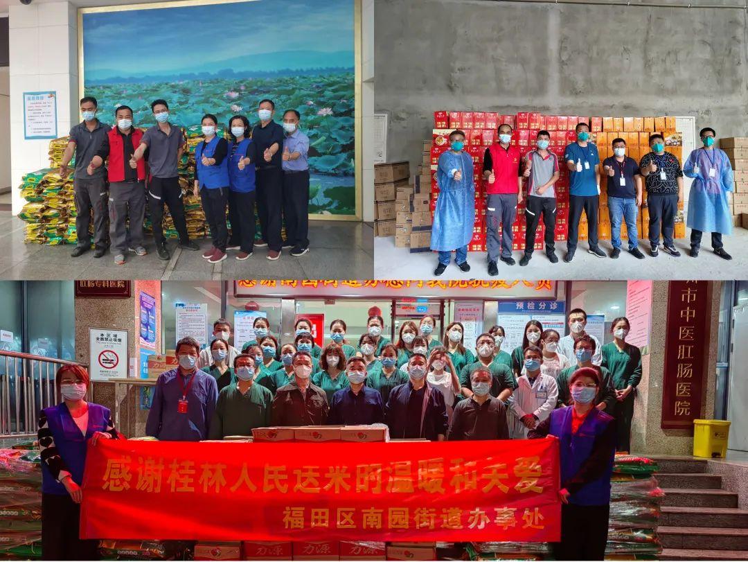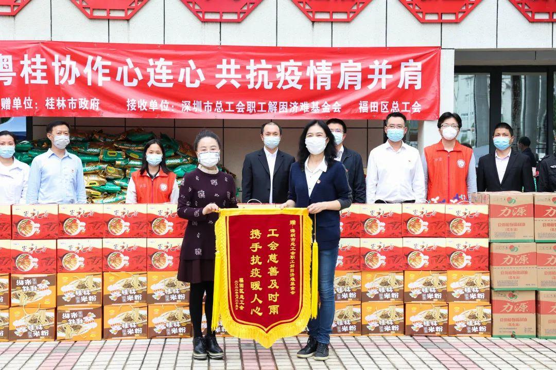▲桂林市政府通过深圳市总工会职工解困济难基金会向福田区防疫抗疫一线捐赠了价值100多万元的米、油、桂林米粉等慰问物资