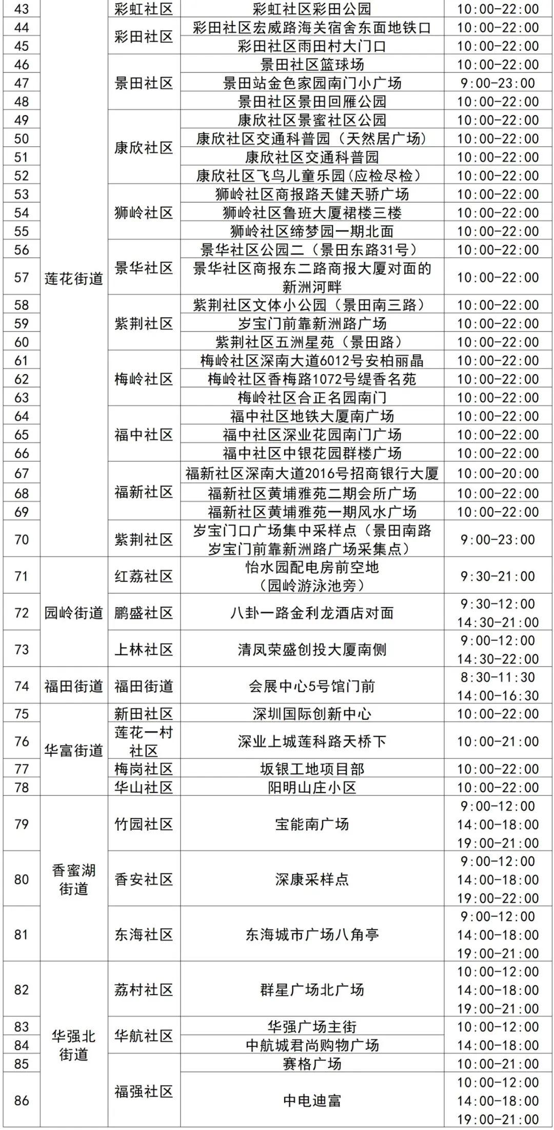 需要注意是,因社区小区、城中村实行“居民白名单制”管理,免费核酸检测采样点名单及检测时间具体以各街道部署为准,请市民持续关注。