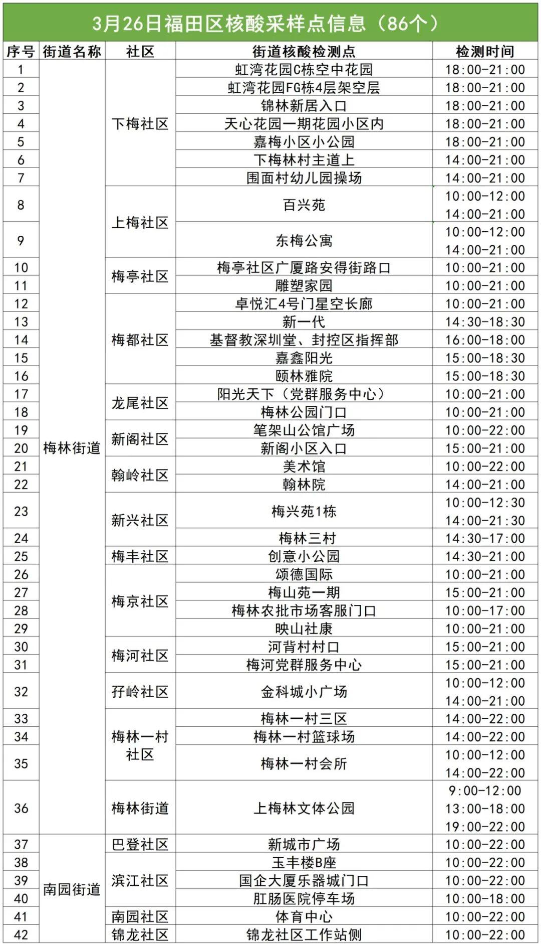 为方便居民进行核酸检测,3月26日,福田区设置86个对外公开的免费核酸检测采样点,为居民提供服务。