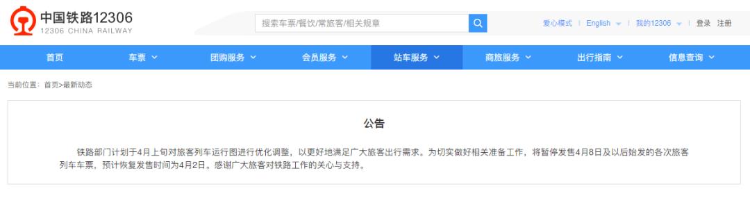 铁路部门计划于4月上旬对旅客列车运行图进行优化调整,以更好地满足广大旅客出行需求。为切实做好相关准备工作,将暂停发售4月8日及以后始发的各次旅客列车车票,预计恢复发售时间为4月2日。感谢广大旅客对铁路工作的关心与支持。