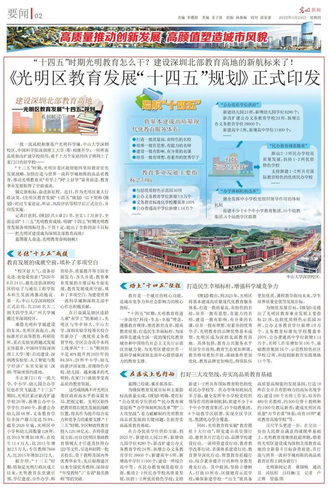 ☞ 宝安日报 近期正式印发实施的《光明区教育发展“十四五”规划》提到,要打好“公办优质学位供给、民办教育规范提质、办学体制机制改革”三大攻坚战,为打造与世界一流科学城相称的高品质、现代化教育夯实基础,并提出了具体指标和实施路径。