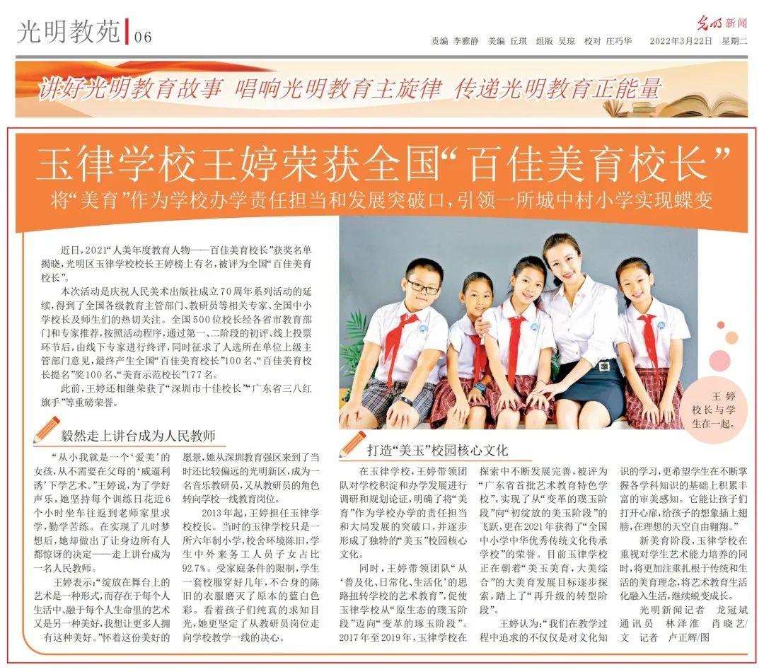 ☞ 近日,2021“人美年度教育人物——百佳美育校长”获奖名单揭晓,光明区玉律学校校长王婷榜上有名,被评为全国“百佳美育校长”。