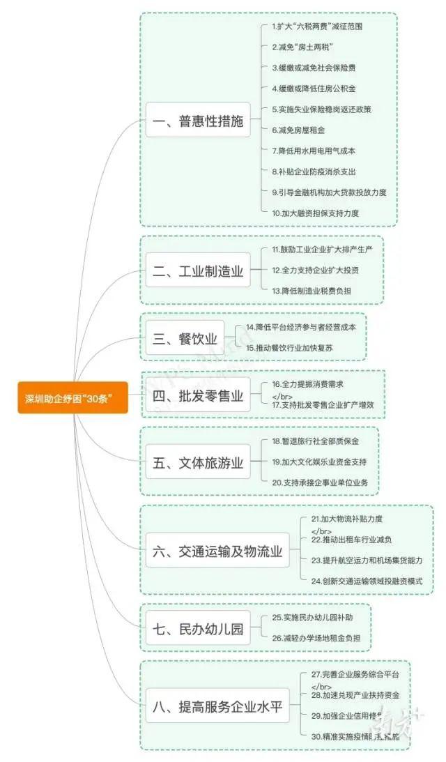 30条分八项,涉及普惠性纾困扶持措施、工业制造纾困扶持措施、餐饮业纾困扶持措施、批发零售业纾困扶持措施、文体旅游业纾困扶持措施、交通运输及物流业纾困扶持措施、民办幼儿园纾困扶持措施、提高服务企业水平。