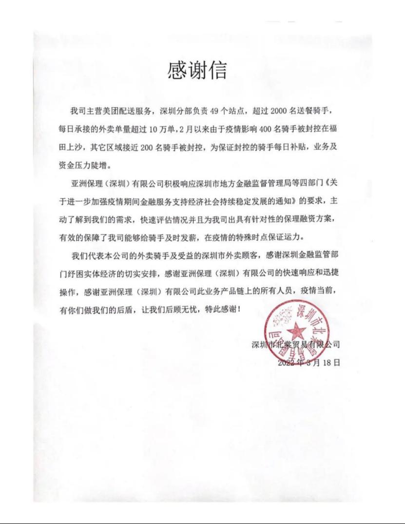 3月18日,获得了由深圳市北棠贸易有限公司官方发来的感谢信。亚洲保理提供的保理融资款为该企业的资金周转提供了支持,缓解了业务陡增的压力。
