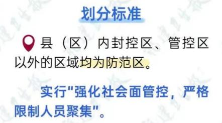 1、防范区实行“强化社会面管控,严格限制人员聚集规模”。严格限制人员聚集,从严落实进入室内公共场所预约错峰、测温、扫码、戴口罩等措施,划定购物区域,限制购物时间,实行错峰出门。