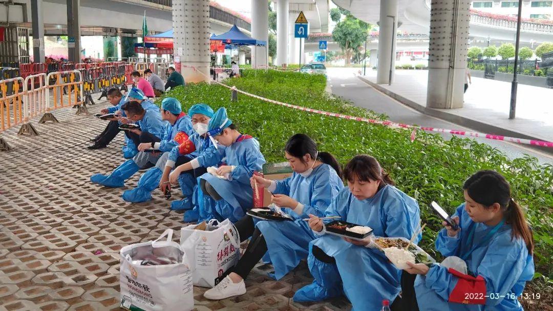 男志愿者们已经帮忙把午饭打回来了,为了避免聚集,街道要求大家分批分段派代表去领取工作餐。非常时期,街道尽量丰富菜式,荤素搭配,保证大家的营养。只听见勺子和饭盒的碰撞声,他们得为下午的奋战蓄积能量。