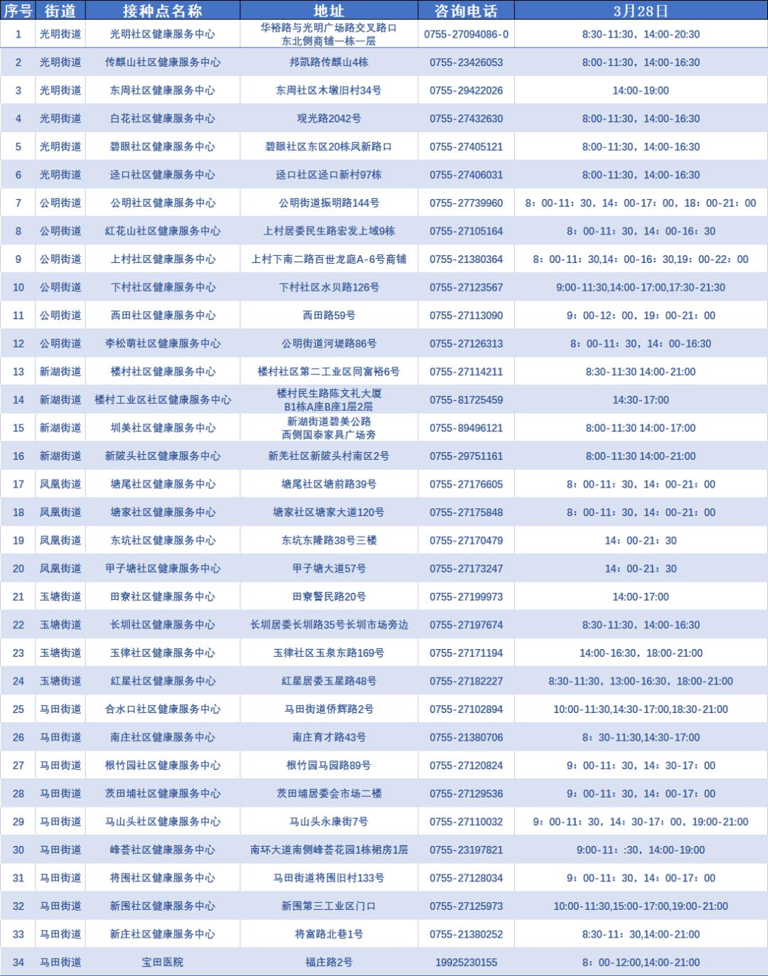 3月28日光明区开放接种点情况如下: