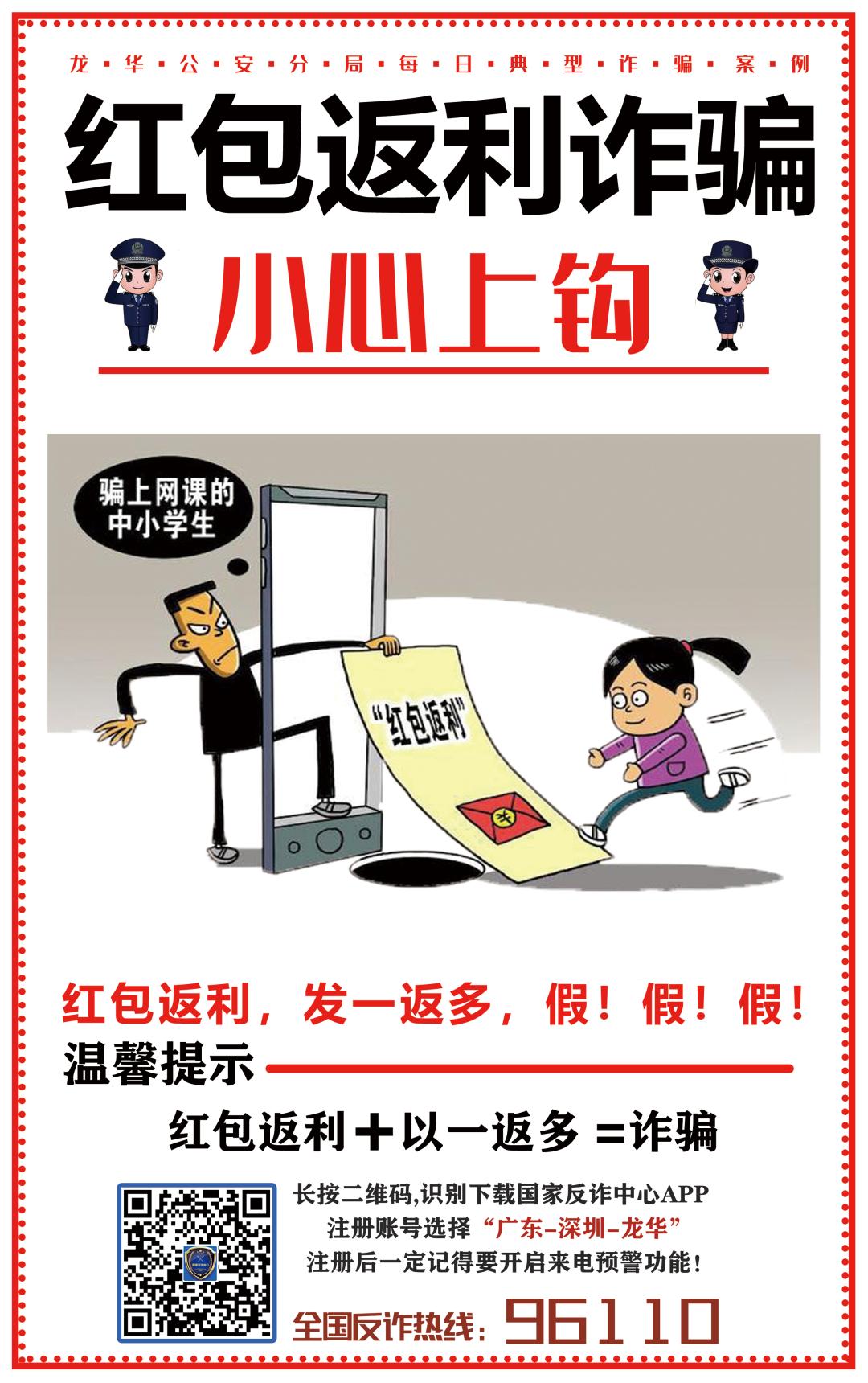龙华某中学高中生小D同学报警称:她在小红书上看到一个送手机的活动图,于是扫描活动图的二维码进入了一个QQ群,并参与活动。其后,群主告知小D中奖了,并让小D提供名字、手机号还有地址等信息。接着对方以邮费、手机激活费为由要求她转账,小D按对方要求多次转账后,对方又通过QQ视频,指引小D修改了家长支付宝的支付密码,并让她用支付宝扫描对方发来的二维码。小D发现妈妈的支付宝被转出去4813.31元,意识到被骗,遂报警,共被骗5124.31元。