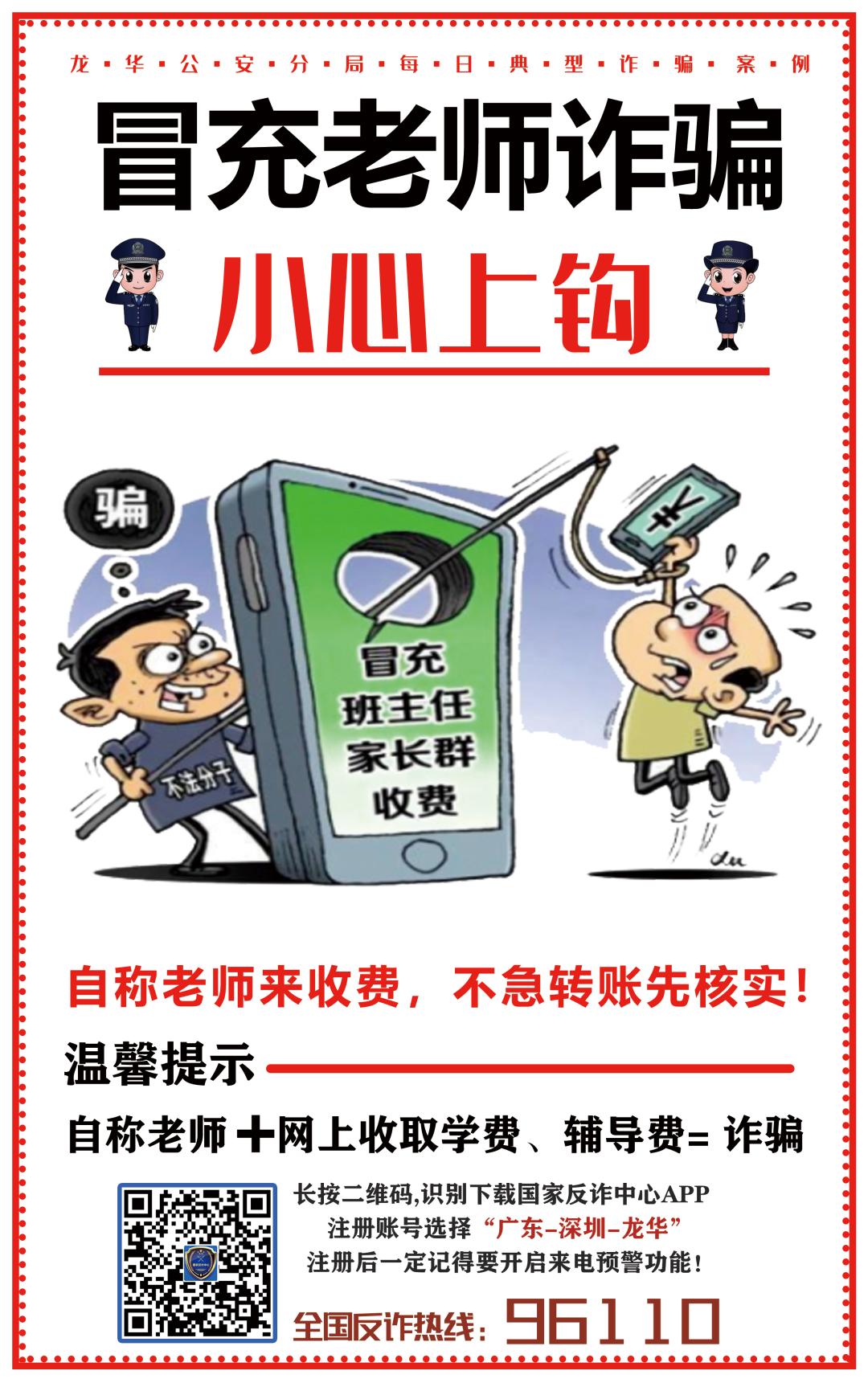 龙华街道甲女士报警称:她在儿子的家长QQ群里,收到孩子“班主任”发布的通知,要求家长缴纳本学期的材料费416元,并留有微信和支付宝的收款二维码。甲女士看到其他家长的转账截图,便未加以核实,直接扫描对方提供的二维码支付了416元。之后,班主任在群里称有人冒充自己发布假的缴款通知,大家不要转账,甲女士意识到被骗,遂报警。