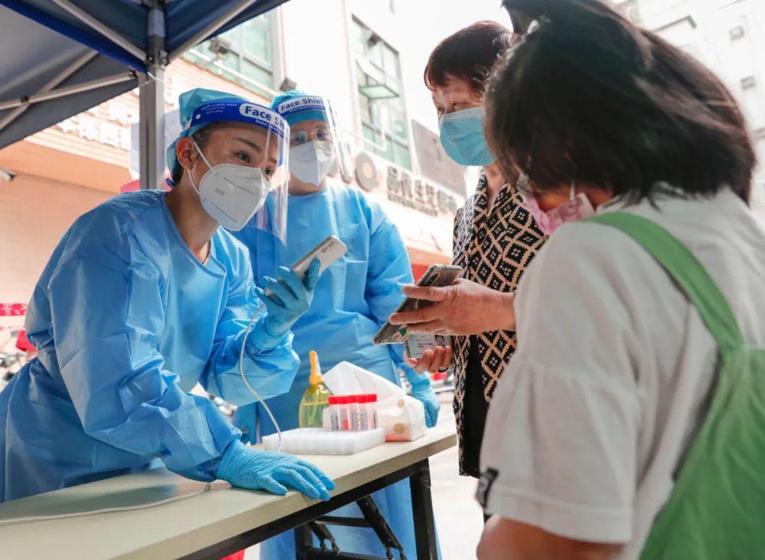 在坂田社区核酸采样点,两位志愿者在现场协助医护人员引导居民有序测温,出示健康码,并耐心地协助居民填写核酸采样信息。