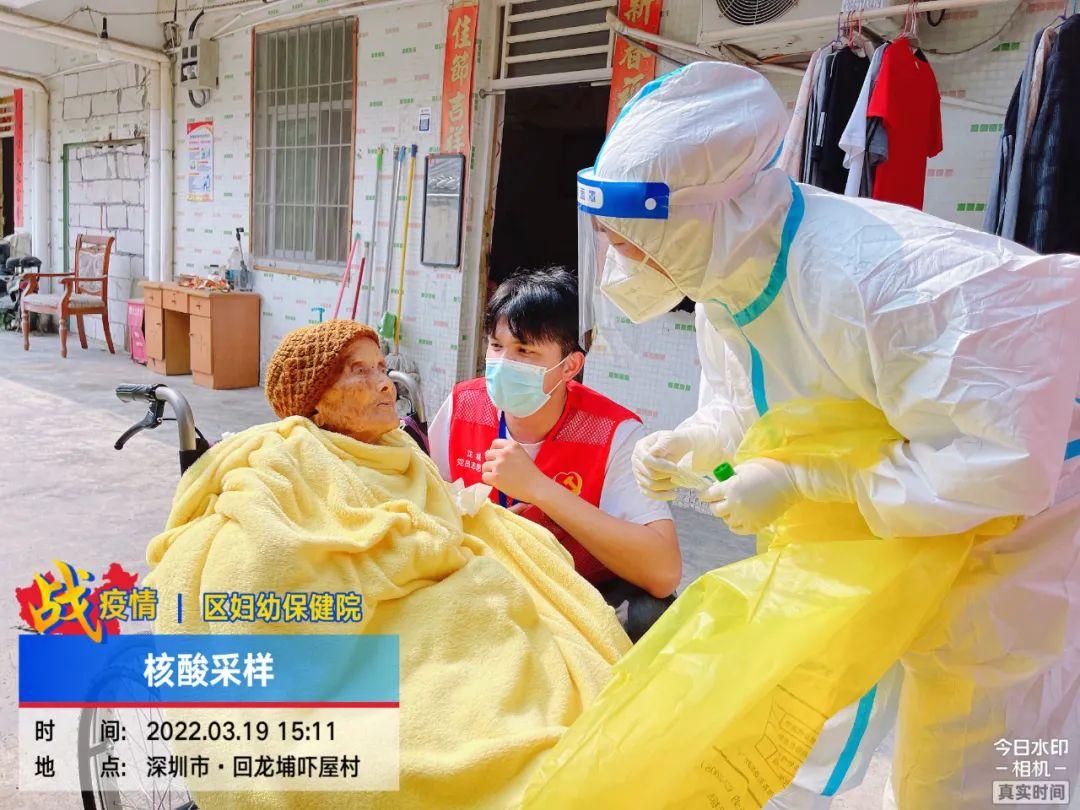在核酸检测期间,龙岗区妇幼保健院的医护人员与社区工作人员一起,为回龙埔社区吓屋村的一位百岁老人进行采样,这一幕令人动容。