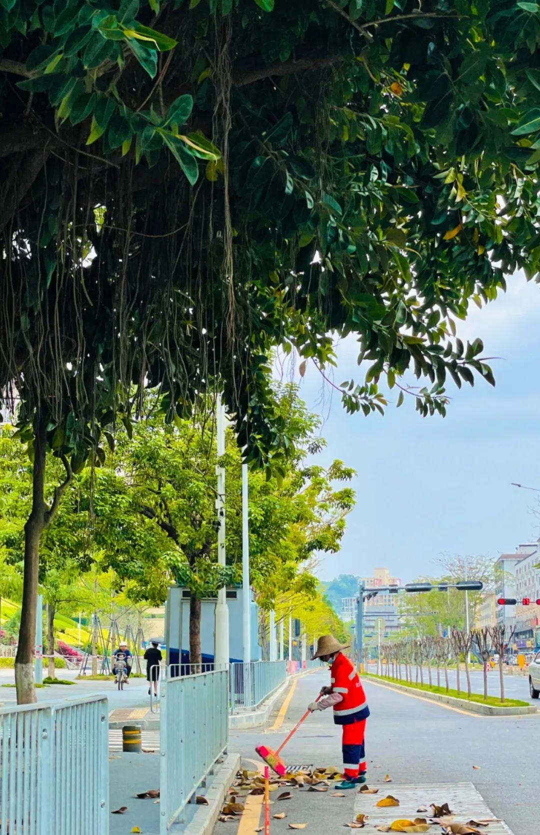 空旷的马路上,一名清洁工阿姨在认真地打扫落叶。龙岗街头这一抹生机勃勃的翠绿和温暖的橘黄真是太美啦!