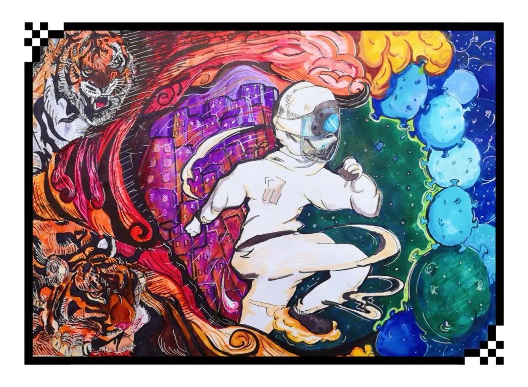 我看到医护人员在一线抗疫的情景,就创作了这幅画。今年是虎年,老虎是百兽之王,代表着正义与光明,我们一定能赢得最后的胜利。