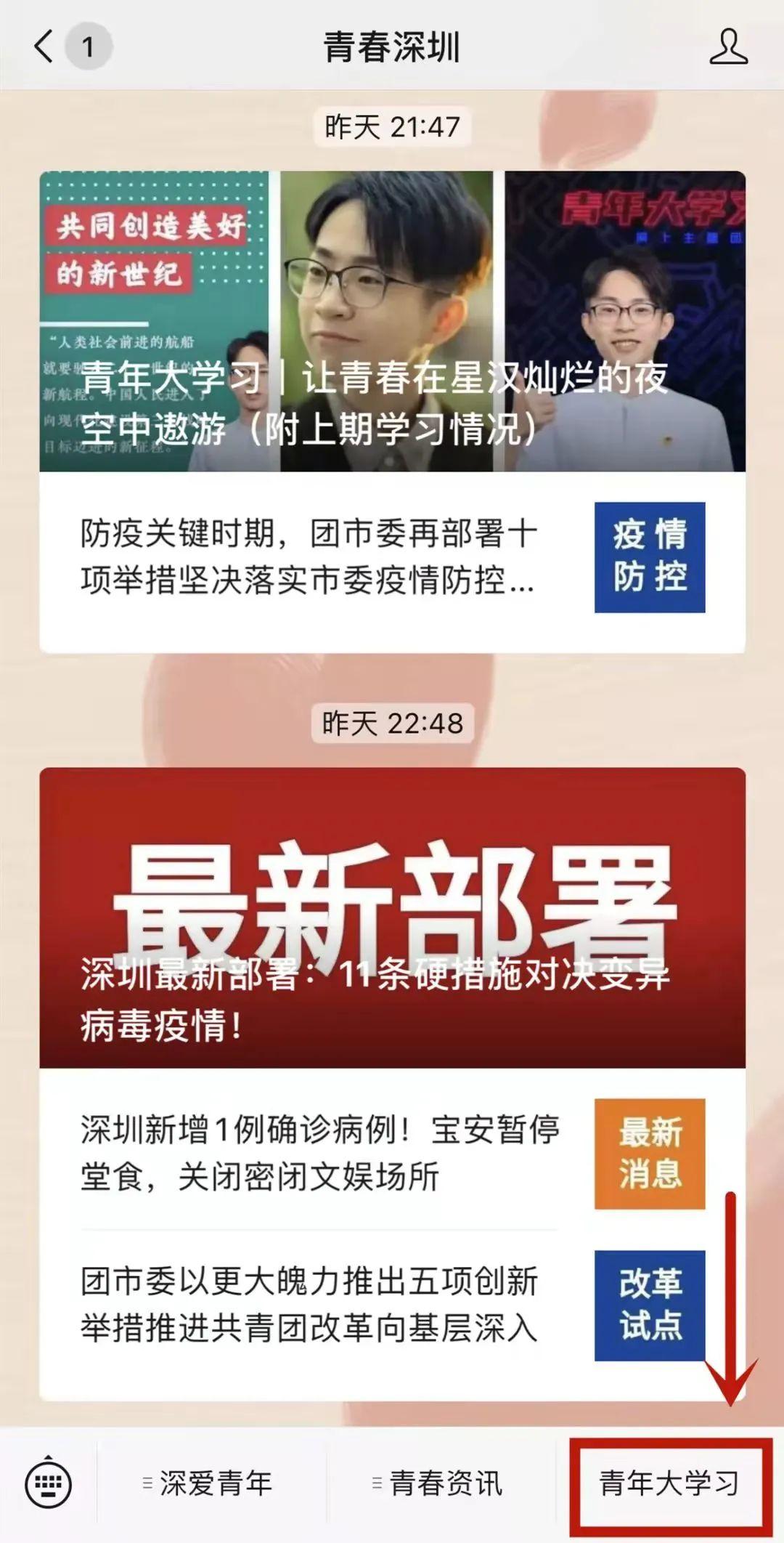 关注“青春深圳”微信公众号,选择菜单“青年大学习”