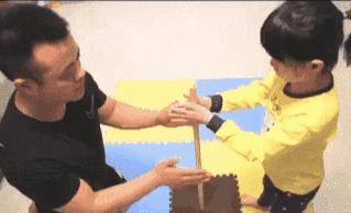 家长和孩子面对面站立,中间放一根比孩子高的木棍,孩子扶住木棍不倒,手放开击一下掌,击掌完毕迅速收回双手再次扶住木棍,通过游戏训练孩子的专注力。